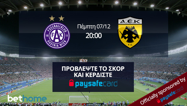 Το αγαπημένο σας στοιχηματικό site σας επιβραβεύει για την εμπιστοσύνη που του δείξατε από την πρώτη μέρα… ζωής του με ακόμη έναν σούπερ διαγωνισμό. Το Bethome σε συνεργασία με την paysafecard σας δίνει τη δυνατότητα να κερδίσετε 100€ προβλέποντας σωστά το σκορ του αγώνα Αούστρια Βιέννης – ΑΕΚ.
