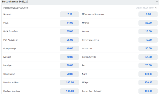 Πρώτο φαβορί για την κατάκτηση του Γιουρόπα Λιγκ είναι η Άρσεναλ η οποία προσφέρεται σε απόδοση 7.50.στην Stoiximan. Στη δεύτερη θέση βρίσκεται η Μάντσεστερ Γιουνάιτεντ με απόδοση 9.00, ενώ στην 3η θέση βρίσκουμε τη Ρόμα στο 14.00. Ακολουθούν Μπέτις, Ρεάλ Σοσιεδάδ και Λάτσιο με 25.00 απόδοση. Το να καταφέρει ο Ολυμπιακός να φτάσει μέχρι τον τελικό και να κατακτήσει το τρόπαιο πληρώνει 70.00!