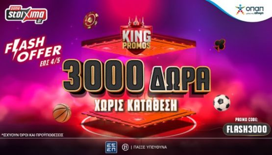 Με τη σούπερ προσφορά* γνωριμίας του Pamestoixima.gr, το παιχνίδι σου αλλάζει επίπεδο! ΜΟΝΟ ΓΙΑ ΣΗΜΕΡΑ (Κυριακή 04/05, 23:59) 3.000 έπαθλα* μπορούν να γίνουν δικά σου με το promo code FLASH3000, εντελώς δωρεάν* χωρίς κατάθεση, για να διασκεδάσεις με όλα τα αθλητικά δρώμενα, αλλά και να περάσεις ευχάριστες στιγμές στο live casino.
