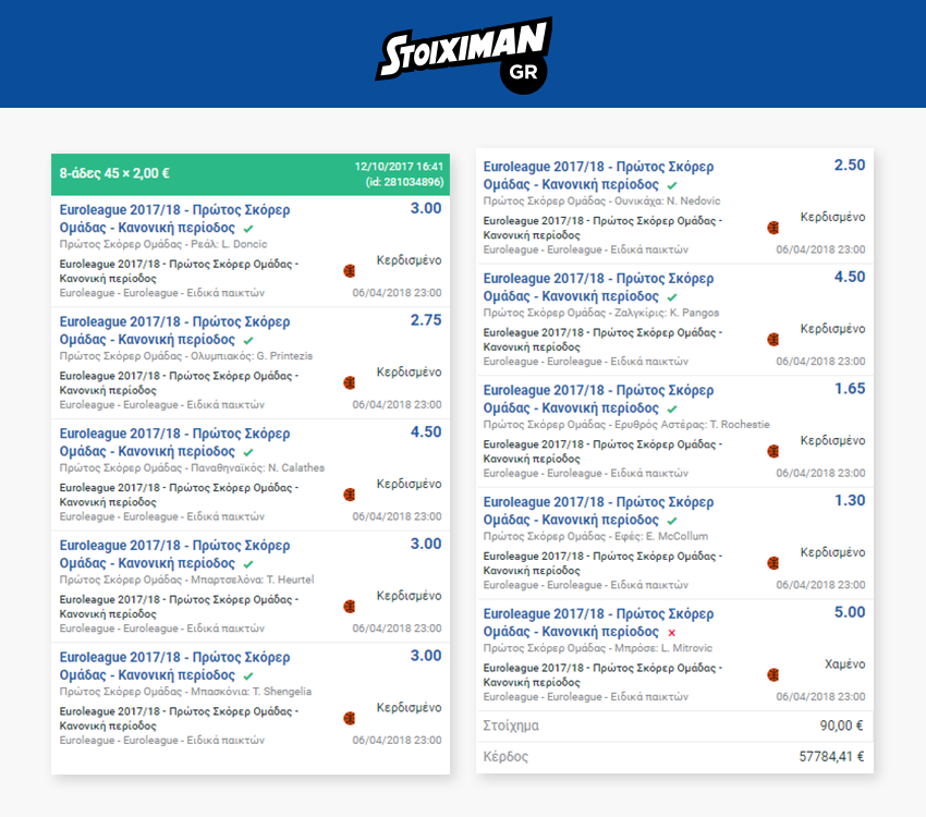 Η έμπνευσή του να στοιχηματίσει από τις αρχές της σεζόν στις ειδικές μακροχρόνιες επιλογές του Stoiximan.gr, Πρώτος Σκόρερ Ομάδας – Κανονική Περίοδος, τον οδήγησε σε αυτή την μοναδική στοιχηματική επιτυχία! Ντόνσιτς (Ρεάλ), Ερτέλ (Μπαρτσελόνα) και Σονγκάιλα (Μπασκόνια) από Ισπανία μεριά, Πρίντεζης και Καλάθης από Ολυμπιακό και Παναθηναϊκό αντίστοιχα, και οι Νέντοβιτς (Μάλαγα), Πάνγκος (Ζάλκιρις), Ροτσεστιέ (Ερυθρός Αστέρας) και Μακόλουμ (Εφές) συνέθεσαν την 9άδια της ευτυχίας, ενώ ο Μίτροβιτς της Μπάμπεργκ δεν έκανε το χατίρι στο μέλος του Stoiximan.gr, στερώντας του τη δυνατότητα να πιάσει το απόλυτο και να εκτοξεύσει ακόμα περισσότερο τα κέρδη του. Αξίζει να σημειωθεί πως το δελτίο (φωτό) περιελάμβανε 10 επιλογές, με ζητούμενα 8άδες και επιβεβαιωμένα κερδισμένα στοιχήματα τα 9 εξ αυτών!
